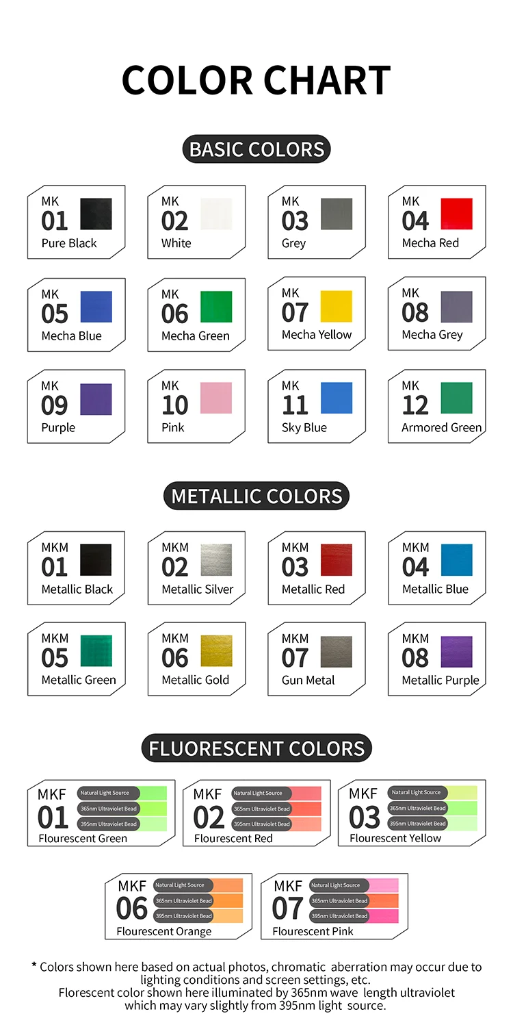 MK-01 Pure Black | MK-02 White | MK-03 Grey | MK-04 Mecha Red | MK-05 Mecha Blue | MK-06 Mecha Green | MK-07 Mecha Yellow | MK-08 Mecha Grey |
